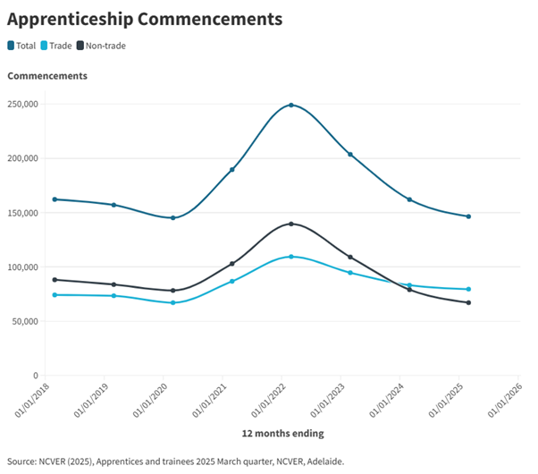 The latest data release from the National Centre for Vocational Education Research (NCVER) for apprentices and trainees in the quarter ending 31 March 2025 shows that apprentice commencement numbers continue to decline. In the trades, commencement numbers declined by 1.8% overall in comparison with the March 2024 quarter. Construction worker commencements were down by 4.2% and automotive and engineering trades worker commencements were down by 3.0%. Some trade occupations saw slight increases.
